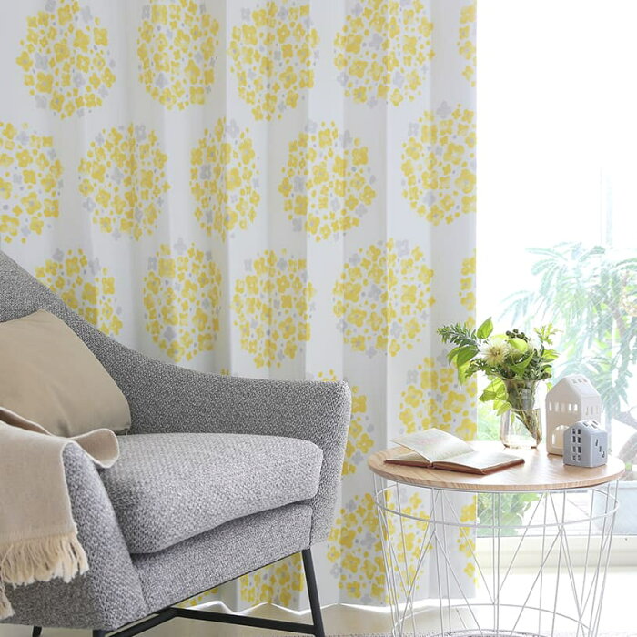 強い日差しやプライバシーをしっかりガード!ほっこり北欧デザイン〜ミーサ〜 イエロー 【撮影カーテン仕様】ヒダ数:1.5倍ヒダ(2つ山) ナチュラルでほっこりする北欧デザインはそのままに、プライバシーと強い日差しをしっかりとガードしてくれる、完全遮光の北欧デザインカーテンが登場しました。