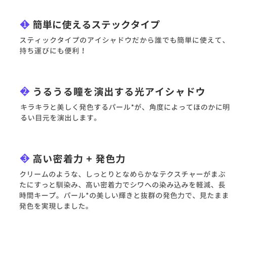 こんなシチュエーションにも 普段使い 通勤用 通学用 おでかけ 旅行 アウトドア ジム通い ヨガ ピラティス ギフト クリスマス プレゼント バレンタイン 就活 誕生日 祝い パッチリ目 アイライナー アイライン 簡単 うるみ目涙袋 うるみ目メイク デカ目メイク パッチリ目メイク メリハリメイク コンツゥアーメイク 立体的 小顔メイク 涙袋ライナー ラメ パール アイシャドウ 涙袋メイク 保湿成分配合 長時間キープ ヨレないメイク 崩れないメイク 潤い うるみ感 キラキラ きらきら ゴールド アイシャドウ アイシャドー アイメイク 若々しい 毛穴 キメ 1位 美肌 潤い 保湿 トレンド パッケージ デザイン かわいい 女の子 コスパ かわいい 韓国コスメ プチプラ オルチャンメイク イガリメイク おフェロメイク 乾燥 肌 ケア ナチュラル 化粧水 芸能人 芸能人愛用 美肌 ウォータープルーフ 透明感 人気 1日続く 崩れない にじまない 滲まない 長時間キープ 美艶 ブラック 目元くっきり グリッター ジュエル 水 汗 ヌードカラー カンタン プロ仕様 高発色ハイライト シェーディング アイホール 繰り出し 繰り出しタイプ メーカー希望小売価格はメーカーサイトに基づいて掲載しています スティックタイプのアイシャドウだから誰でも簡単に使えて、持ち運びにも便利! キラキラと美しく発色するパール*が、角度によってほのかに明るい目元を演出します。