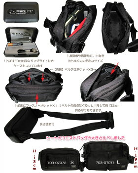 【PORTER HEAT】(ポーターヒート) 2010 A/W 追加型 703-07972 WAIST BAG (S) PORTERロゴ入りのマグライト(ケース付き)がフロントのファスナーポケット 引き手にとりつけられ一番のアクセントになっています。