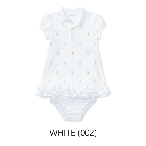 【商品番号】310-676237 【ブランド名】 POLO RALPH LAUREN 【カラー】WHITE(002) DELICATE PINK(003) 【サイズ】3M(60cm) 6M(70cm) 9M(75cm) 12M(80cm) 18M(85cm) 24M(90cm) 【素材】本体:綿 100% 衿:綿 100% 袖口:綿 100% 装飾部分:ポリエステル 100% 【仕様】・洗濯機洗い可 ・A ラインのシルエット ・全体にシグネチャーのポニー刺繍 ・リブのポロカラー / 3つボタンの前立て ・半袖のパフドスリーブ、リブアームバンド ・ラッフルの裾 / お揃いのブルマー付き ※注意:刺繍の配置は、商品によって異なります。