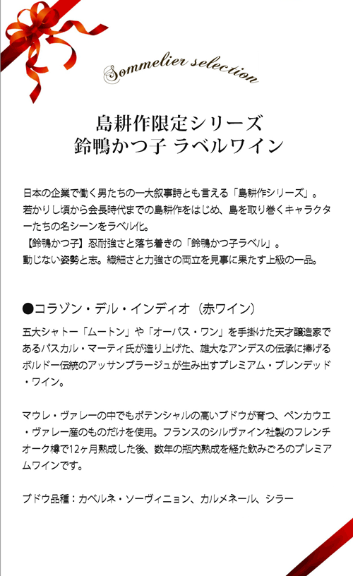 品名島耕作限定シリーズ 鈴鴨かつ子 ラベルワイン(コラゾン・デル・インディオ)※クール便ご指定の場合は別途300円(税別)頂戴いたします。