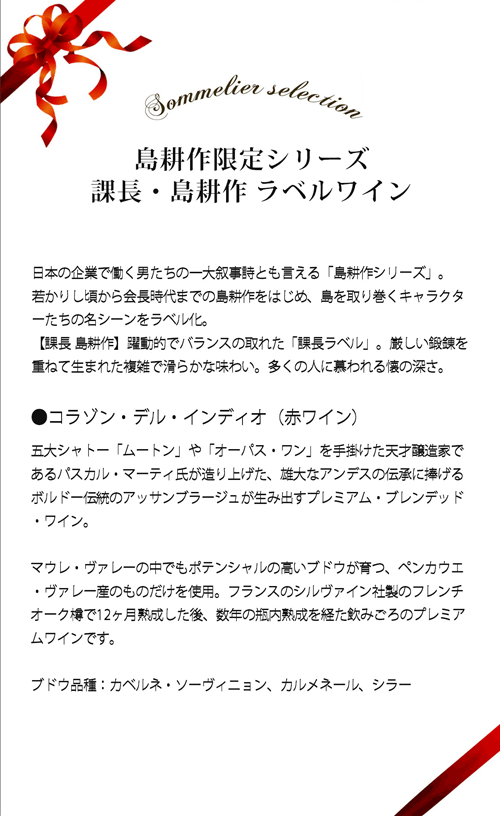 品名島耕作限定シリーズ 課長・島耕作 ラベルワイン(コラゾン・デル・インディオ)※クール便ご指定の場合は別途300円(税別)頂戴いたします。