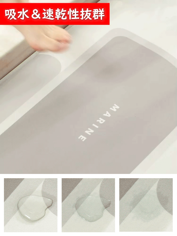 珪藻土の抜群な吸水性と速乾性を保つため、お風呂あがりの足元の水滴を珪藻土に急速吸水されサラサラです。